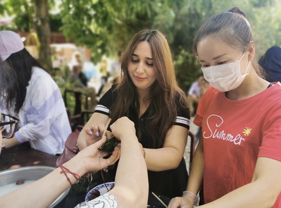 16 foreigners from 10 countries attended various celebration activities, including collecting wormwood leaves, knitting lucky rings, learning to embroider sachets, weaving flower ropes, making zongzi and frying oil cakes to experience the traditional Chinese Dragon Boat Festival in Yiqu village of Xiaojin town in Qingyang, Northwest China's Gansu province on June 24, 2020. [Photo provided to China Daily]