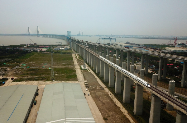 The first train leaving Nantong West Railway Station for Shanghai runs on the Shanghai-Suzhou-Nantong Yangtze River Bridge on July 1, 2020. [Photo by Gao Erqiang/chinadaily.com.cn]