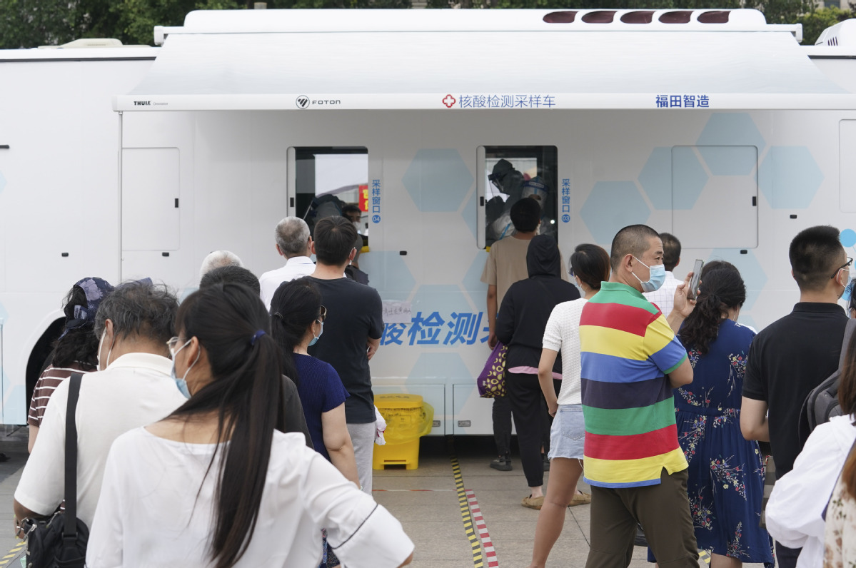 Medical staff take nucleic acid samples from people in Beijing's Xicheng district from the newly-adopted mobile testing vehicles in June. [Photo by Feng Yongbin/China Daily]