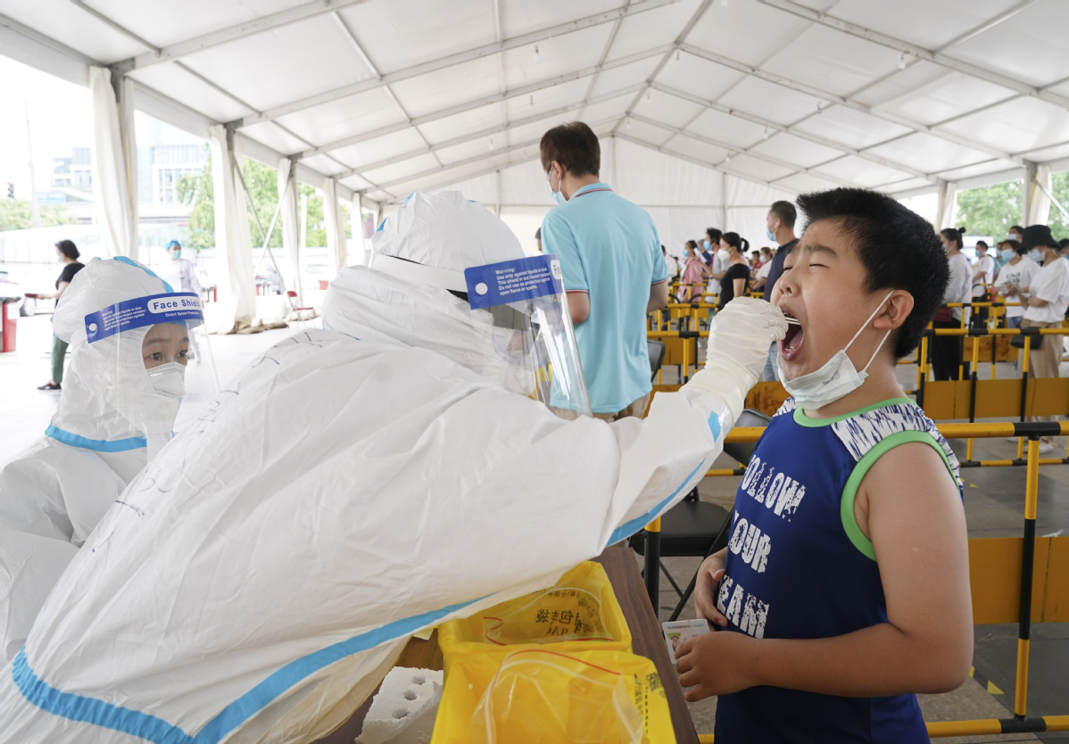 Medical staff take nucleic acid samples from people in Beijing's Xicheng district from the newly-adopted mobile testing vehicles in June. [Photo by Feng Yongbin/China Daily]