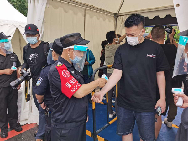 During the drill, all people entering the exhibition halls were ordered to wear face masks, showcase health codes, line up at intervals of 1 meter from each other, have their body temperature measured and get their personal belongings checked.