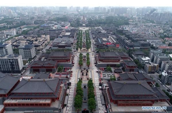A view of a commercial street near the Giant Wild Goose Pagoda scenic spot in Xi'an, Northwest China's Shaanxi province on April 23, 2020. [Photo/Xinhua]