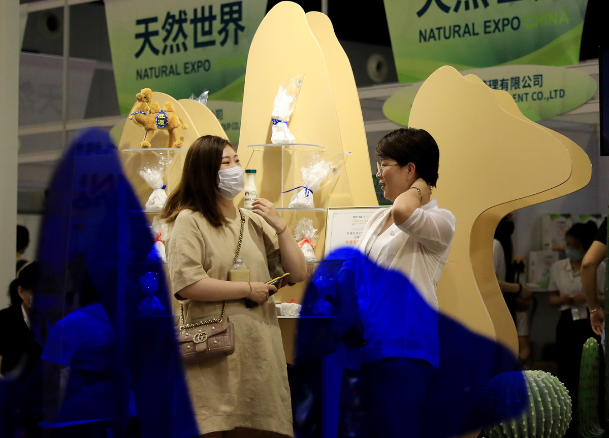 A visitor (left) communicates with a staff member during the BioFach China in Shanghai. [Photo/Xinhua]