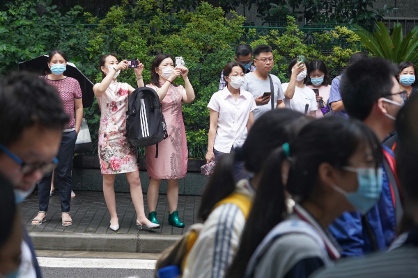 Teachers and parents watch as students enter Gezhi Middle School in Huangpu district in Shanghai on Tuesday to take their college entrance examination. [Photos by Gao Erqiang / chinadaily.com.cn]