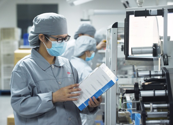 Staff members at Shijiazhuang-based Yiling Pharmaceutical check packages of Lianhua Qingwen, one of the company's most notable products. [Photo provided to chinadaily.com.cn]