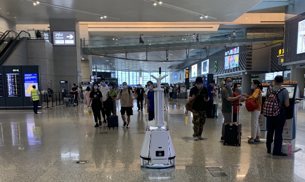 A robot named Hongbao moves around to disinfect up to 10,000 sqm of public space every day. [Photo by Wang Ying/chinadaily.com.cn]