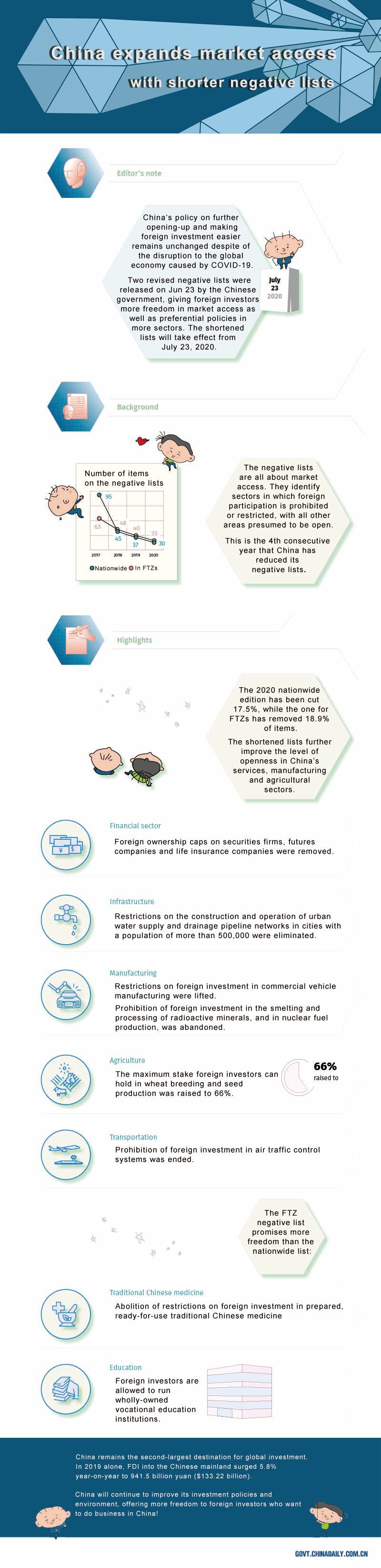 Two revised negative lists were released on Jun 23 by the Chinese government, giving foreign investors more freedom in market access as well as preferential policies in more sectors. The shortened lists will take effect from July 23, 2020.