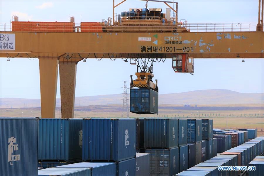 A crane loads containers at the Manzhouli Railway Station, the largest land port on the China-Russia border, in North China's Inner Mongolia autonomous region, on July 1, 2020. [Photo/Xinhua]