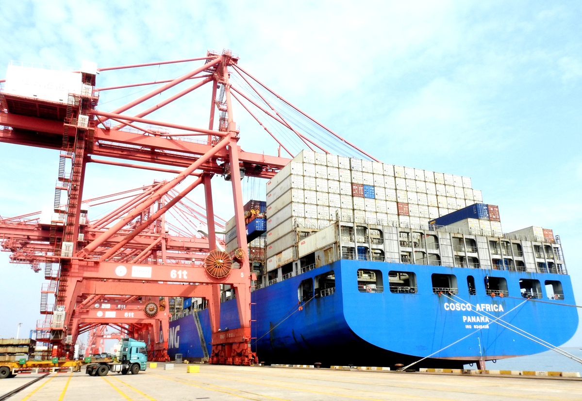 A container vessel unloads its cargo at a port in Lianyungang, Jiangsu province, on Tuesday. China's foreign trade has gradually recovered from the impact of the COVID-19 pandemic. [Photo by GENG YUHE/FOR CHINA DAILY]