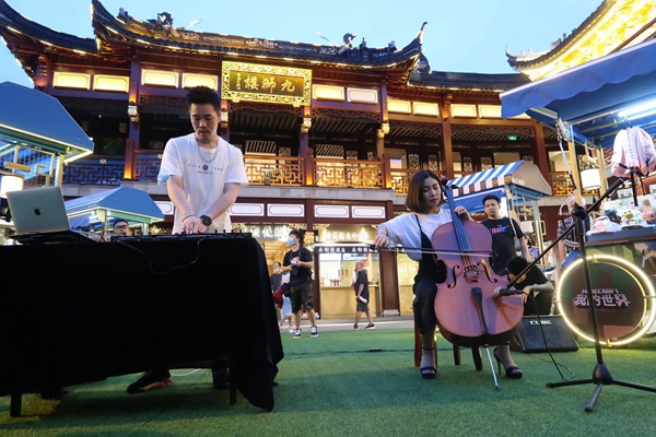 Cellist Wendy Lee performs in Yu Garden's central square during weekend evenings.[Photo by Xing Yi/China Daily]