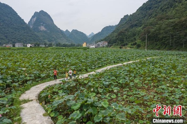 Utilizing the rich water resources and beautiful scenery of Yadong village, Jiuxu town has transformed more than 400 mu (26.67 hectares) of rice fields into lotus ponds. It has carried out comprehensive industrial development by growing fish in the ponds, growing passion fruit by the ponds, and developing lotus seed products. The output value of the lotus ponds reached more than 5,000 yuan ($713.88) per mu, greatly increasing farmers' incomes and boosting poverty alleviation industries in Jinchengjiang district.