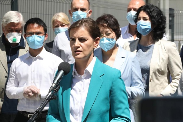 Serbian Prime Minister Ana Brnabic (Front) speaks at the opening ceremony of a new Fire Eye laboratory in Nis, southeastern Serbia, on July 30, 2020. The new Fire Eye laboratory for detection of COVID-19 opened in Nis on Thursday, becoming the country's second after the first in Belgrade. [Government of Serbia/Handout via Xinhua]
