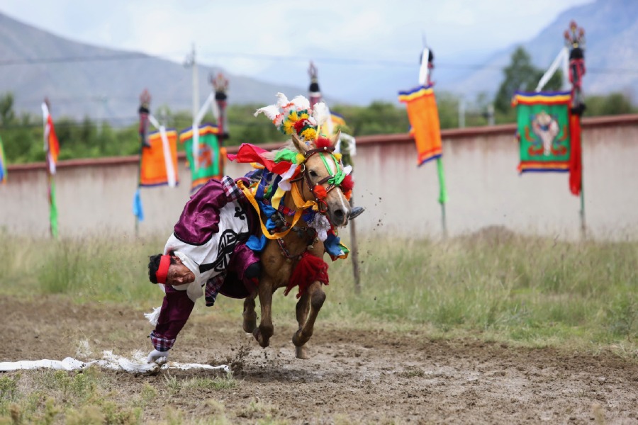 Farmers dressed in festive costumes take part in a horse race to celebrate the Wangguo Festival at Sangda village in Lhasa, Southwest China's Tibet autonomous region, on Aug 2, 2020. The Wangguo Festival, which has a history of more than 1,500 years, is a traditional festival of Tibetan people to greet the forthcoming harvest. [Photo by Daqiong/chinadaily.com.cn]