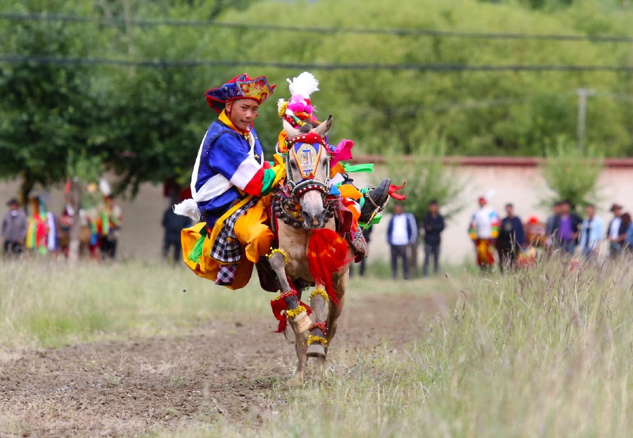 Farmers dressed in festive costumes take part in a horse race to celebrate the Wangguo Festival at Sangda village in Lhasa, Southwest China's Tibet autonomous region, on Aug 2, 2020. The Wangguo Festival, which has a history of more than 1,500 years, is a traditional festival of Tibetan people to greet the forthcoming harvest. [Photo by Daqiong/chinadaily.com.cn]