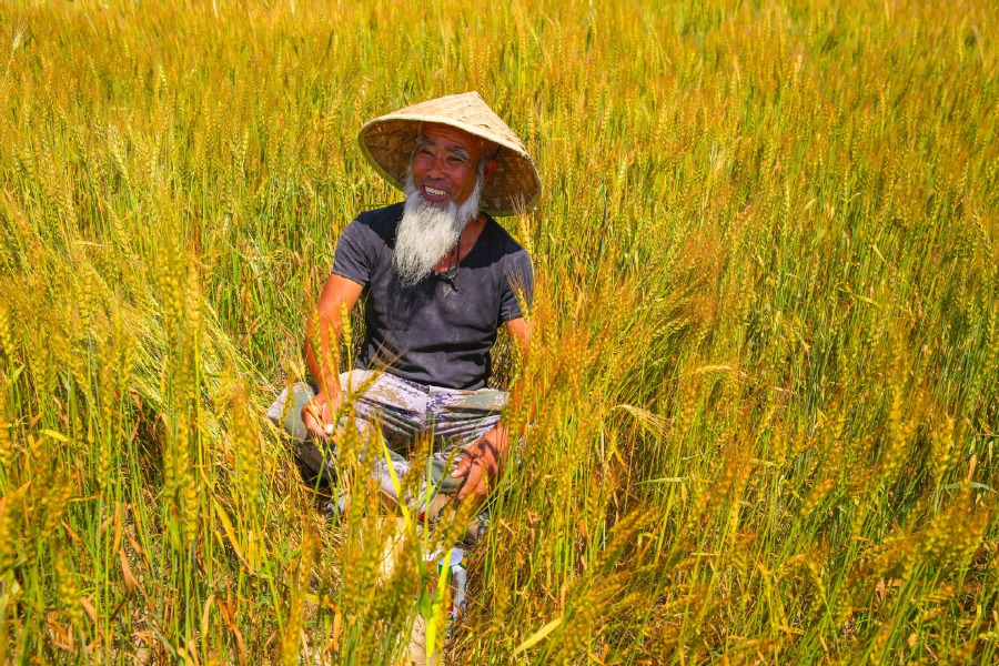 A farmer smiles with joy at the wheat harvest at Shengyijindi Farm in Taonan, Jilin province. [Photo by Qiu Huining/for chinadaily.com.cn]