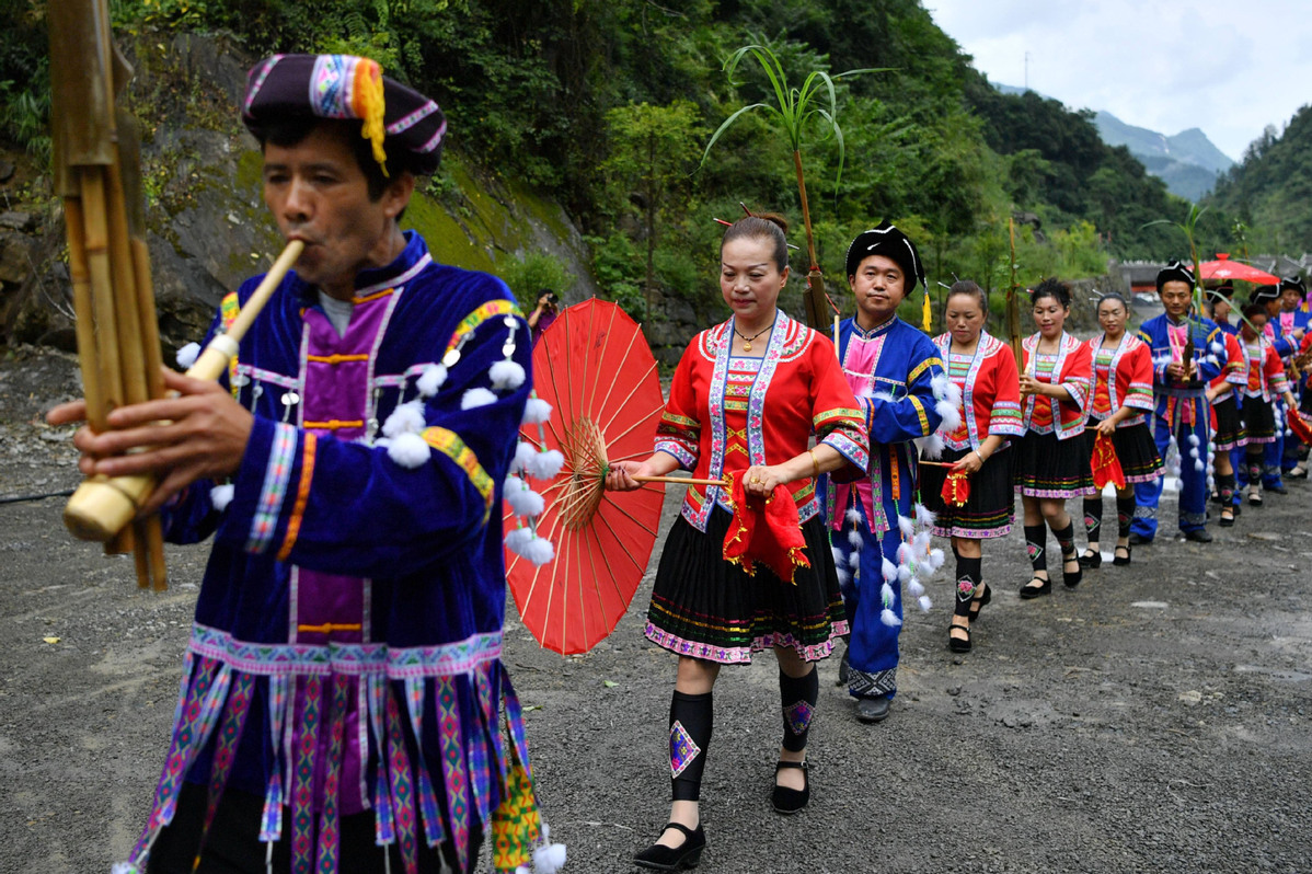 People play traditional musical instruments created by the Dong ethnic group, Liangxihe village, Enshi Tujia and Miao autonomous prefecture, Central China's Hubei province, Aug 9, 2020. Highlighting a unique folk cultural experience, local rural tourism has witnessed an unprecedented boom in recent years.[Photo/Xinhua]