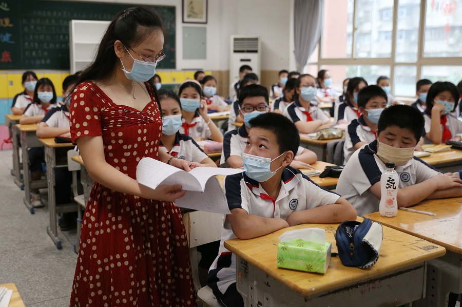 A teacher takes class at Hubei Shuiguohu No 1 Middle School in Wuhan, Central China's Hubei province, on Aug 10, 2020. [Photo by Wu Xiaohui/chinadaily.com.cn]