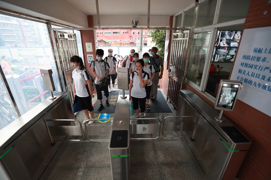 Students pass the face recognition system before entering classrooms at Hubei Shuiguohu No 1 Middle School in Wuhan, Central China's Hubei province, on Aug 10, 2020. [Photo by Zhao Jun/chinadaily.com.cn]