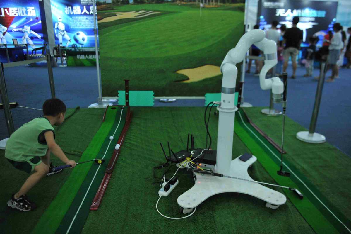 A child plays golf with a robot in a robot-themed park during the ongoing 30th Qingdao International Beer Festival on Tuesday. [Photo by Yu Fangping/for chinadaily.com.cn]