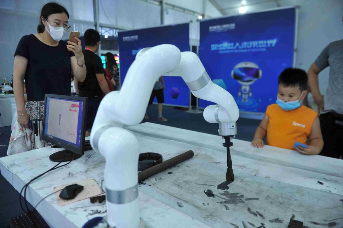 Visitors watch a robot practicing calligraphy during the ongoing 30th Qingdao International Beer Festival. [Photo by Yu Fangping/for chinadaily.com.cn]