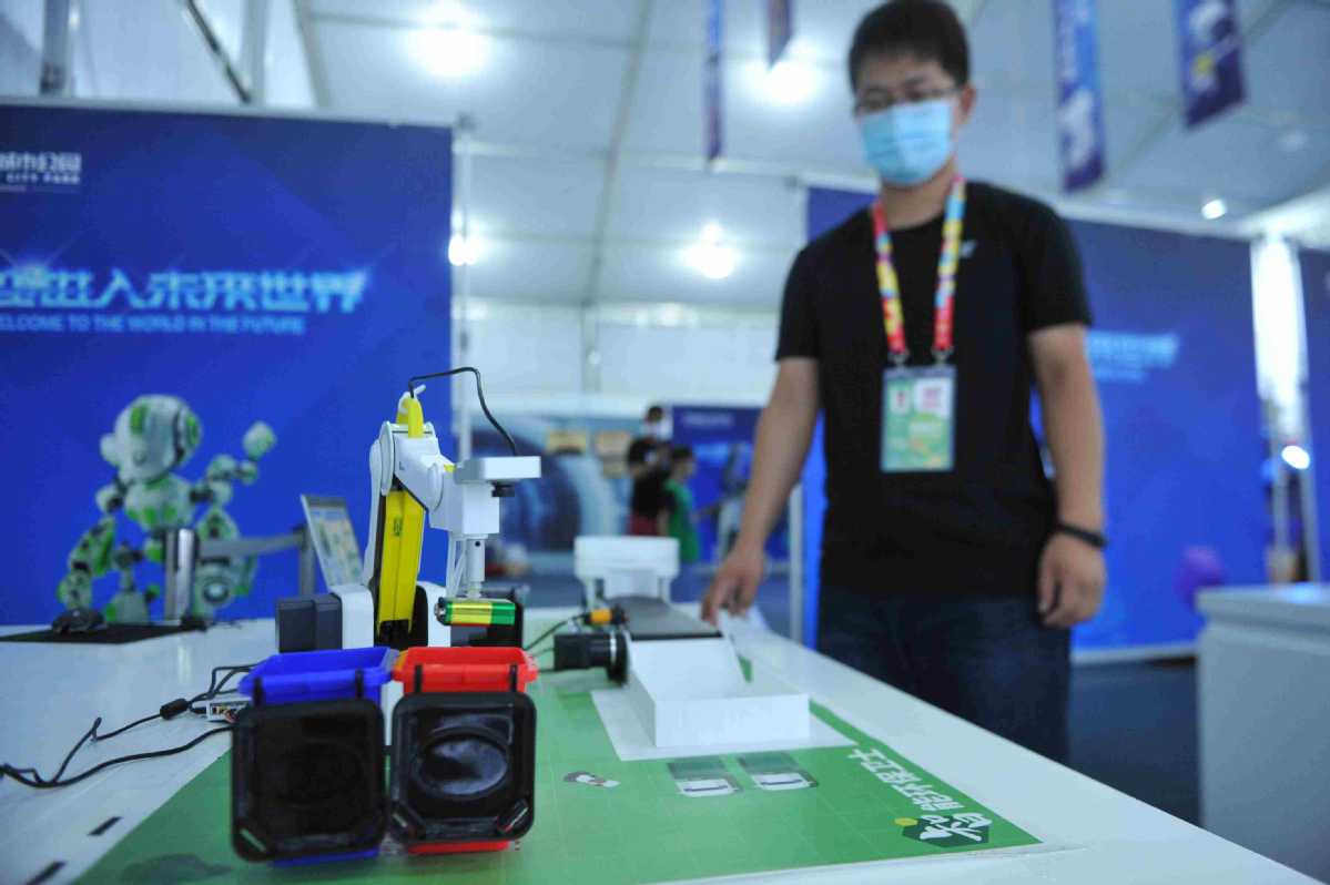 A man watches a robot sorting trash during the ongoing 30th Qingdao International Beer Festival. [Photo by Yu Fangping/for chinadaily.com.cn]