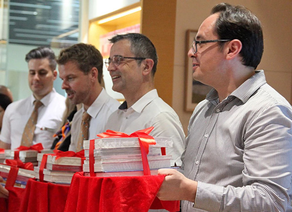 Some foreign experts are awarded books at the launch ceremony in Suzhou on Aug 11. [Photo/WeChat account: snd-szgxqfb]