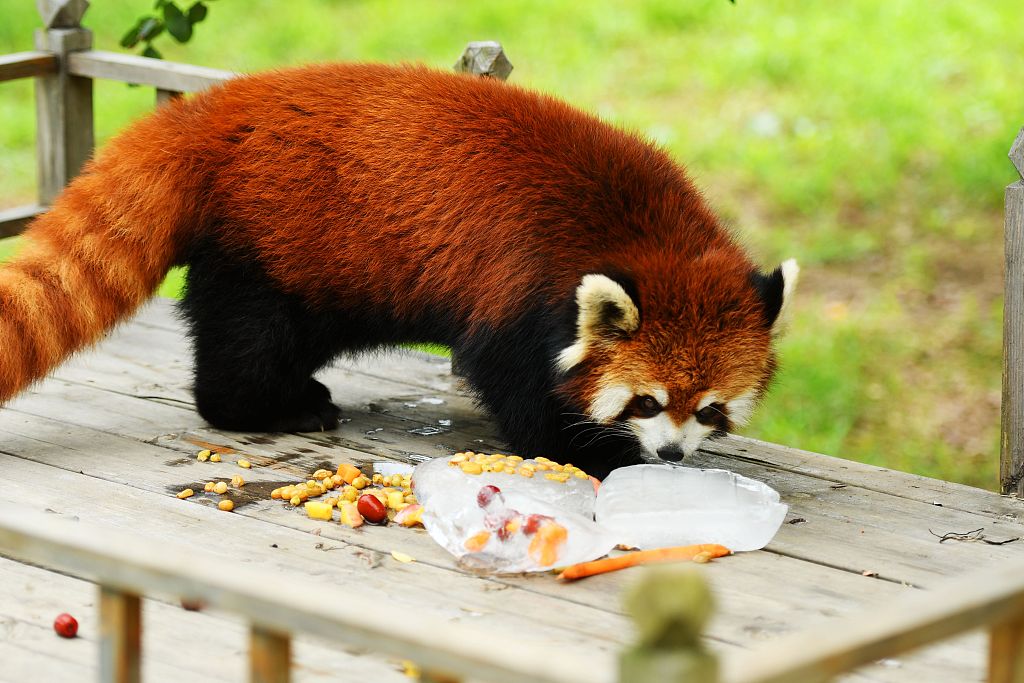 A red panda sniffs some fruit ice cubes. [Photo/VCG]