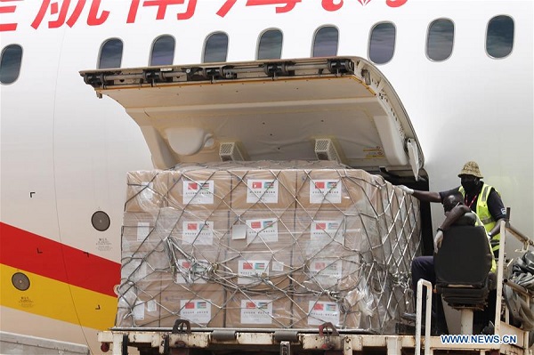 Airport workers unload medical supplies donated by Chinese government at Juba International Airport in Juba, South Sudan, on Aug. 19, 2020. A team of Chinese medical experts arrived in South Sudan on Wednesday to strengthen the east African nation's fight against the COVID-19 pandemic. [Photo by Gale Julius/Xinhua]