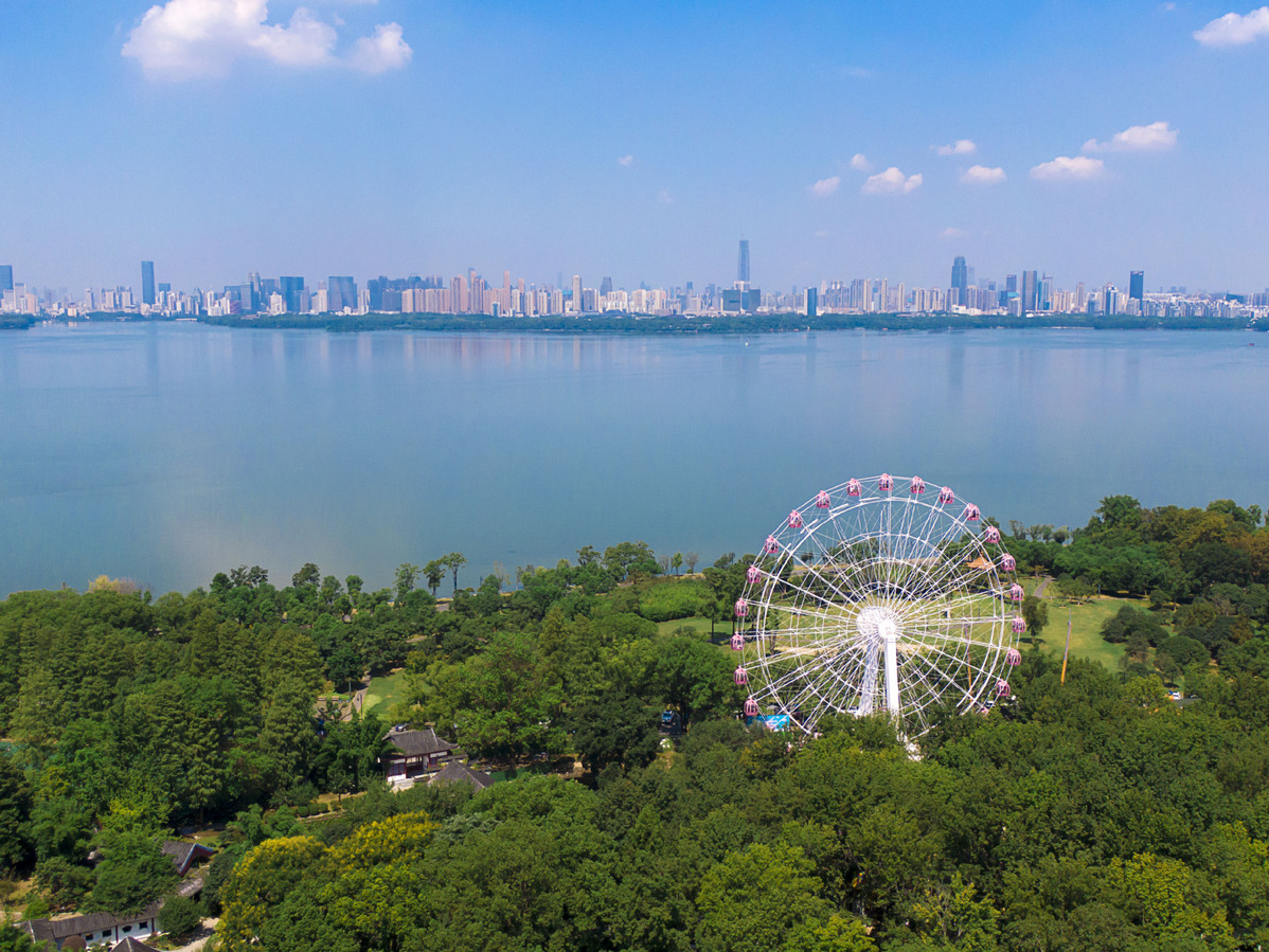 Aerial photo taken on Aug 17, 2020 shows a ferris wheel near the Donghu Lake in Wuhan, Central China's Hubei province. The ferris wheel, dubbed "Donghu Eye", opened to the public on Tuesday. It is equipped with 28 capsules holding up to 112 people.[Photo/Xinhua]