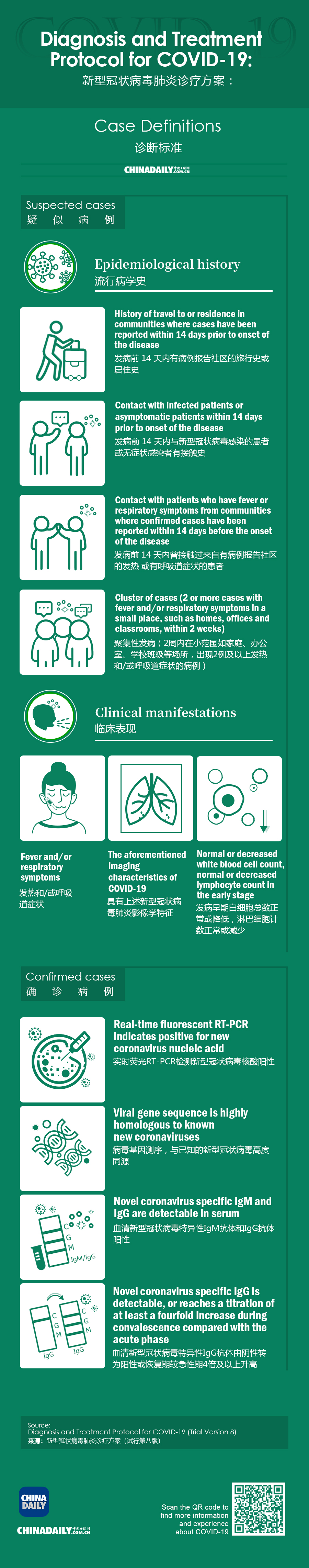 China's National Health Commission recently issued the latest protocol on diagnosis and treatment of COVID-19. Let's have a look at some key points from the protocol through graphics.