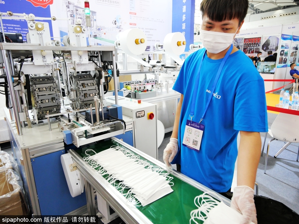 A staff member shows masks to potential buyers at the 28th Guangzhou Expo Medical and Health Industry Exhibition in Guangzhou, Guangdong province, on Aug 29, 2020. [Photo/Sipa]