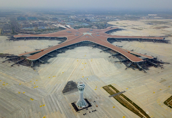 An aerial photo taken on June 25, 2019 shows the west control tower and terminal building of the newly-built Daxing International Airport in Beijing. [Photo/Xinhua]