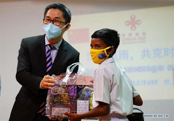 Hu Wei, Chargé d'affaires of the Chinese embassy to Sri Lanka, hands over a gift to a student, at the auditorium of the Al Hidaya school in Colombo, Sri Lanka, Sept 2, 2020. Over 700 students from 19 schools in Sri Lankan capital city have received gifts of stationery and panda school bags from the Chinese embassy to Sri Lanka. [Xinhua/Tang Lu]