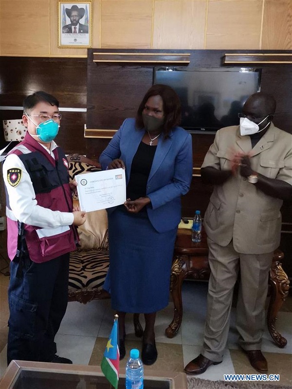 South Sudan's health minister Elizabeth Achuei Yol (C) awards a certificate to the Chinese medical expert team in Juba, South Sudan, Sept 6, 2020. The Chinese medical expert team finished its anti-virus missions in South Sudan and Guinea, and left for China from Juba on Sept 6. [Chinese Embassy in South Sudan/Handout via Xinhua]