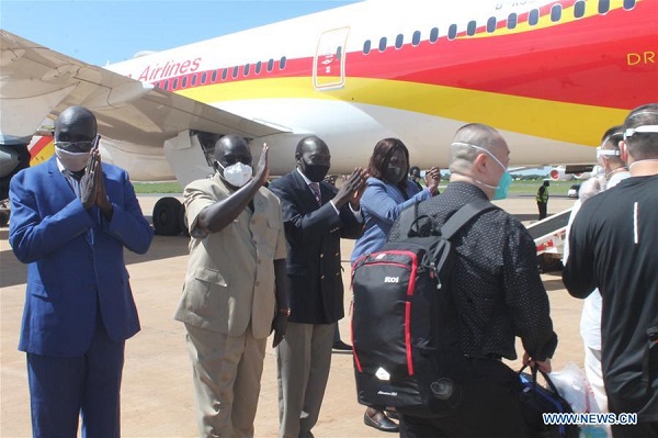 South Sudan's health minister Elizabeth Achuei Yol (4th L) sees off the Chinese medical expert team and the seventh batch of Chinese medical team, in Juba, South Sudan, Sept 6, 2020. The Chinese medical expert team finished its anti-virus missions in South Sudan and Guinea, and left for China from Juba on Sept 6. [Photo by Gale Julius/Xinhua]