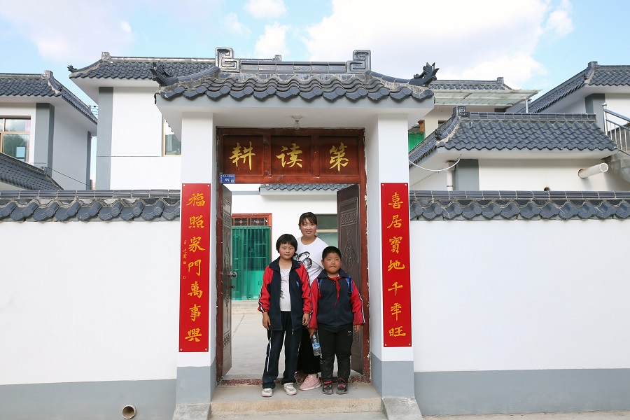 Chen Jundi, 38, and her children, who just came home from school, pose for a photo on the doorstep of their new home in the poverty alleviation resettlement site of Lidian village, Tongwei county, Northwest China's Gansu province, on Sept 4, 2020. Chen said she worried very much about her children in the past, as they had to walk about one hour to get to school, but after moving to their new home, they can walk to school in about 10 minutes. [Photo by Wu Xiaohui/chinadaily.com.cn]