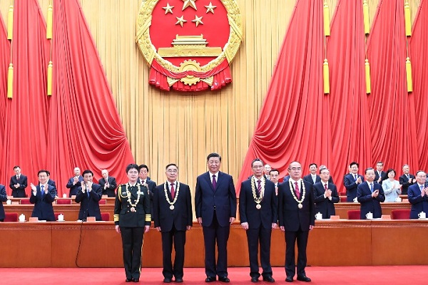 During the meeting, Xi presented the Medal of the Republic to renowned respiratory disease expert Zhong Nanshan, and the national honorary title "People's Hero" to Zhang Boli, a traditional Chinese medicine expert; Zhang Dingyu, head of Jinyintan Hospital in Wuhan, Hubei province; and Chen Wei, a military biomedical expert, for their outstanding contributions to the country's fight against COVID-19.