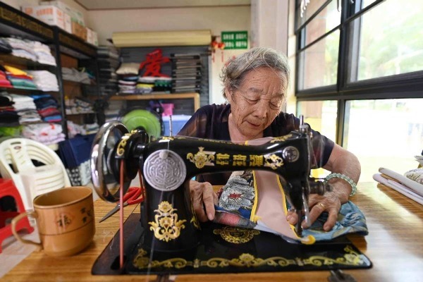 At an eco-awareness center in Hainan province, 83-year-old Zhao Yueying uses a sewing machine to turn secondhand garments into cloth bags, which are given to residents and tourists to replace plastic bags.