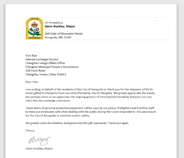 "I am writing on behalf of the residents of the city of Annapolis to thank you for the shipment of KN-95 masks gifted to Annapolis from our sister city of Changsha," Annapolis Mayor Gavin Buckley wrote in the letter. "We greatly appreciate the masks, but perhaps more so we appreciate the ongoing gesture of international friendship between our two cities that this exchange represents."