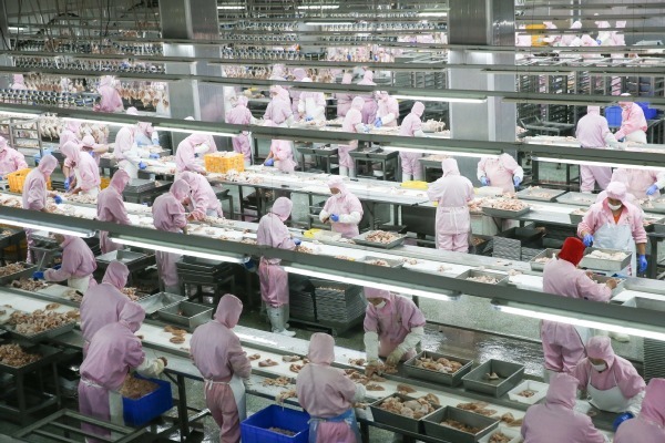 Workers process chicken on the production lines of a chicken processing plant set up in Zhenyuan county of Northwest China's Gansu province to help relieve poverty, on Sept 6, 2020. Zhenyuan county is one of the eight counties in Gansu that has not yet shaken off poverty. [Photo by Wu Xiaohui/chinadaily.com.cn]