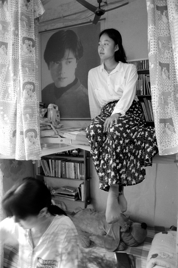 Yu Langtian, a student of journalism school in 1994, sits on her bed, with a poster of Hong Kong actor Aaron Kwok on the wall, with her classmate Liao Yan (foreground) in a dormitory building of Wuhan University. [Photo by Wang Jingchun/Ultimate Vision]