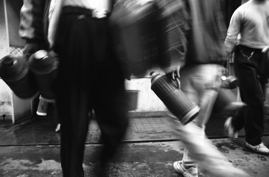 Students take thermos flasks to take hot water from a boiler room in Wuhan University in 1995. [Photo by Wang Jingchun/Ultimate Vision]