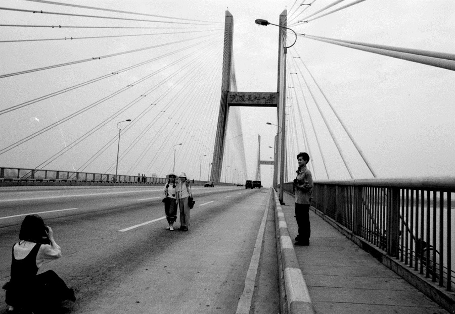 Journalism students take photos on the Second Yangtze River Bridge that had just opened to traffic in Wuhan at a photography practice course. [Photo by Wang Jingchun/Ultimate Vision]
