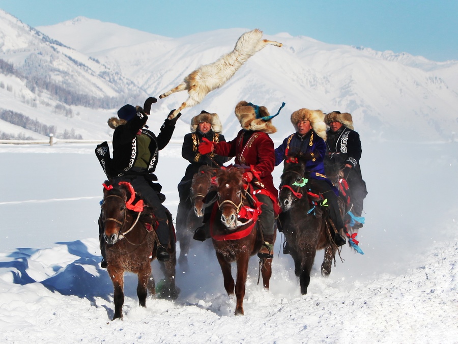 Members of the Kazak ethnic group participate in an ice activity in Xinjiang. [Photo by Mao Weihua/chinadaily.com.cn]