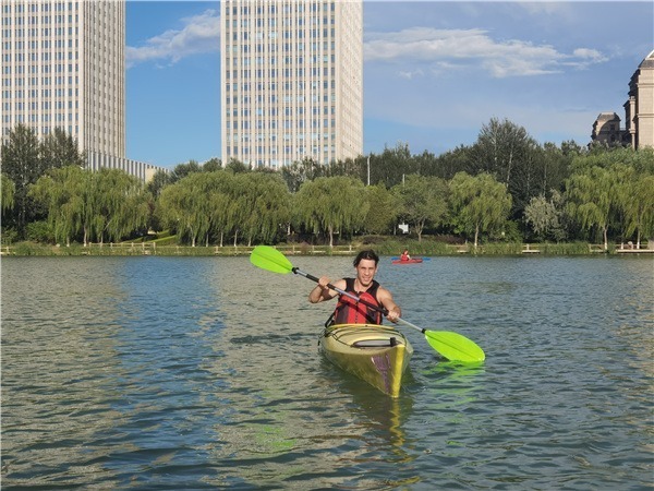 Algerian Mebarkia Seif Eddine practices kayaking on Diannong River, Yinchuan, Ningxia Hui autonomous region, on Sept 1. [Photo by Hu Dongmei/China Daily]