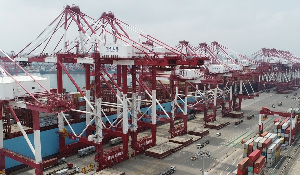 Cargo is loaded onto ships at Qingdao port in Shandong province in July. [Photo/ZHANG JINGANG/FOR CHINA DAILY]