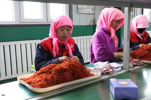 Workers package safflower in small bags at a poverty relief workshop of wormwood processing at Xiabao village in Xiji county, Northwest China's Ningxia Hui autonomous region, Sept 9, 2020. The workshop established under support from Minning township in Yinchuan, capital of the region, went into operation in October 2018. [Photo by Wu Xiaohui/chinadaily.com.cn]