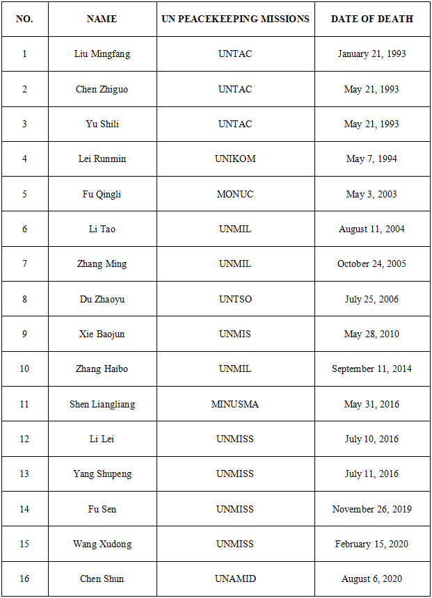 Over the past 30 years, China's armed forces have contributed more than 40,000 service members to 25 UN peacekeeping missions. Sixteen Chinese military peacekeepers have sacrificed their lives for the noble cause of peace. As of August 2020, 2,521 Chinese military peacekeepers were serving on eight UN peacekeeping missions and at UNHQ. Chinese service women are playing an increasingly important role in peacekeeping. More than 1,000 female peacekeepers have worked in medical support, liaison, coordination, demining, explosive ordnance disposal, patrol, observation, gender equality promotion, protecting women and children, and other fields. They demonstrated the talent and professionalism of Chinese women on their UN missions. Chinese peacekeeping troops have been commended by the UN and the international community for their contribution. They have won honor for their country and military. On October 1st, 2019, Chinese military peacekeepers were reviewed for the first time by the country and the people in the parade celebrating the 70th anniversary of the PRC.