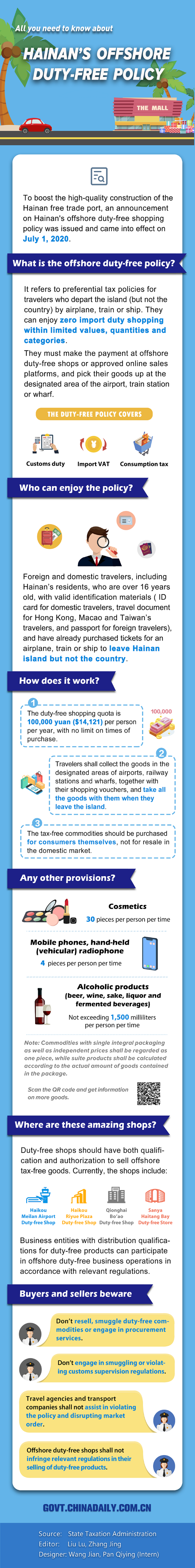 To boost the high-quality construction of the Hainan free trade port, an announcement on Hainan's offshore duty-free shopping policy was issued and came into effect on July 1, 2020.