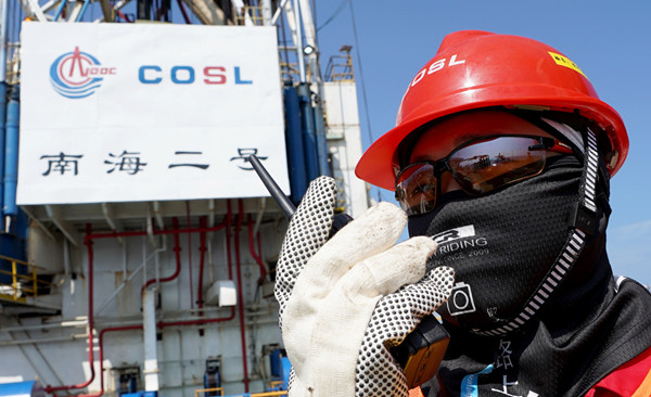 A CNOOC employee uses a wireless communication device on an offshore drilling platform in the South China Sea. [Photo/Wang Yuguo for China Daily]